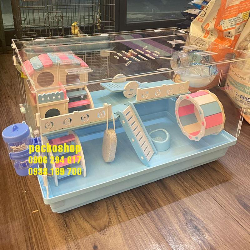Kích thước:Dài 21cm ,rộng 15cm ,cao 15,5cm. Phụ kiện kèm theo : whell chạy ,chén ăn ,bình nước chân không. Các bạn có thể nuôi được 1 cặp hamster dóng nhỏ như robo ,campel ,winter nhé.